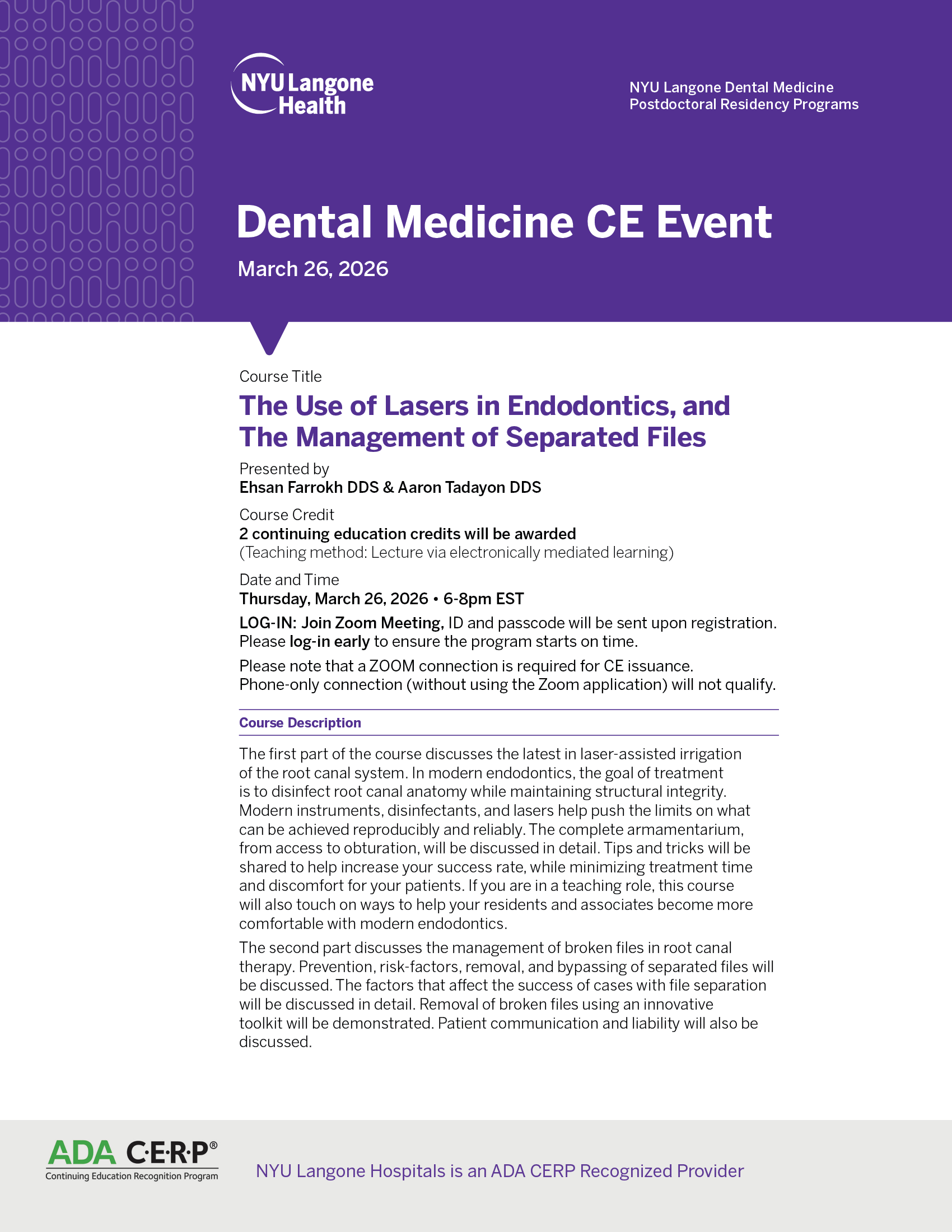 Dental Medicine CE Event-The Use of Lasers in Endodontics, and The Management of Separated Files